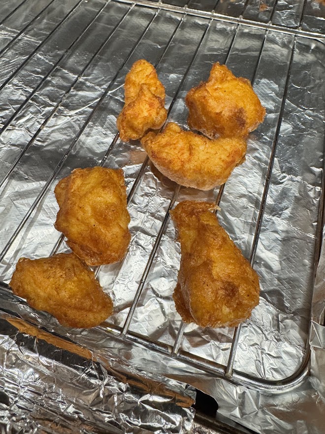 Once I get my heat up I start cooking the chicken in batches of about 5 or 6 pieces at a time, 3 minutes at 365 degrees. The chicken goes on a wire rack, and I wait until the heat goes back up in between batches before I put the next batch in.