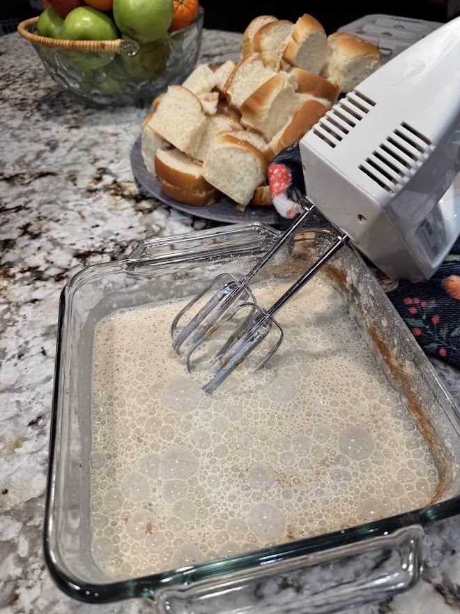 Add your flour and cream to a casserole dish (or whatever you plan on using for the egg mixture…I hate dishes so one pan it is.) Use a hand mixer until it’s all combined, then add your eggs, milk, vanilla, and cinnamon. Mix again until well combined.